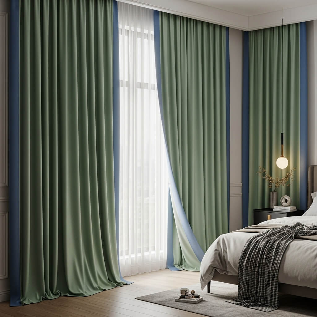 Plain curtains feel boring. I use sage green curtains with a blue border to frame my windows and give the room structure.