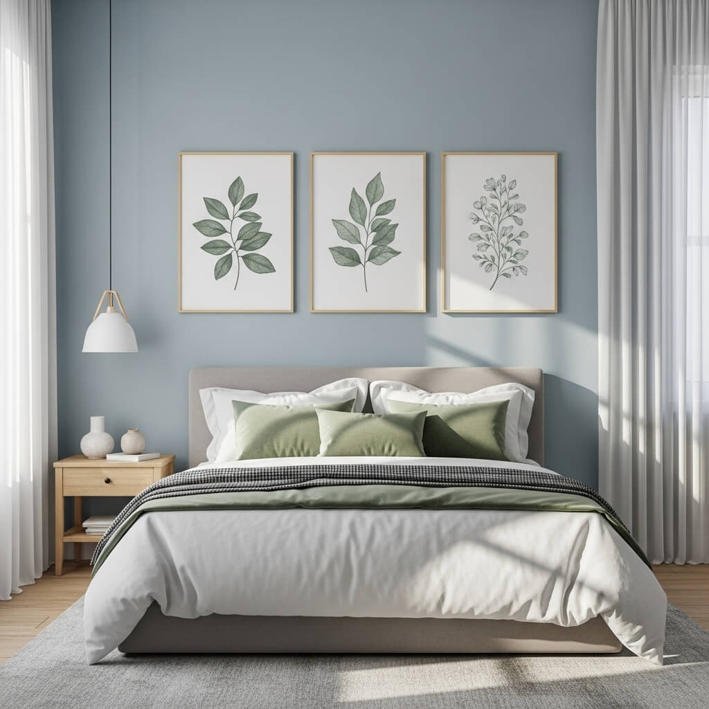 I hang sage green botanical prints against blue walls for contrast that never feels harsh. The colors pop in a calm way.