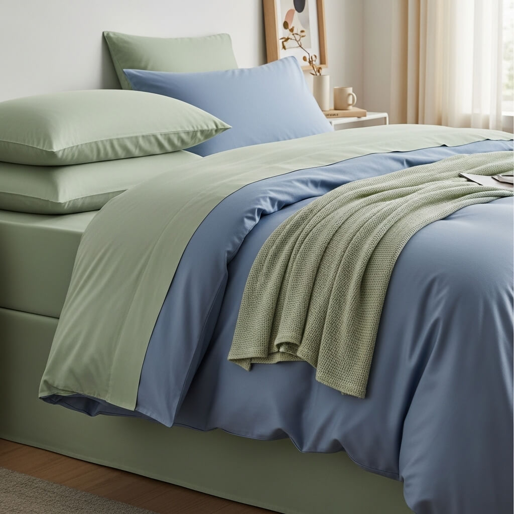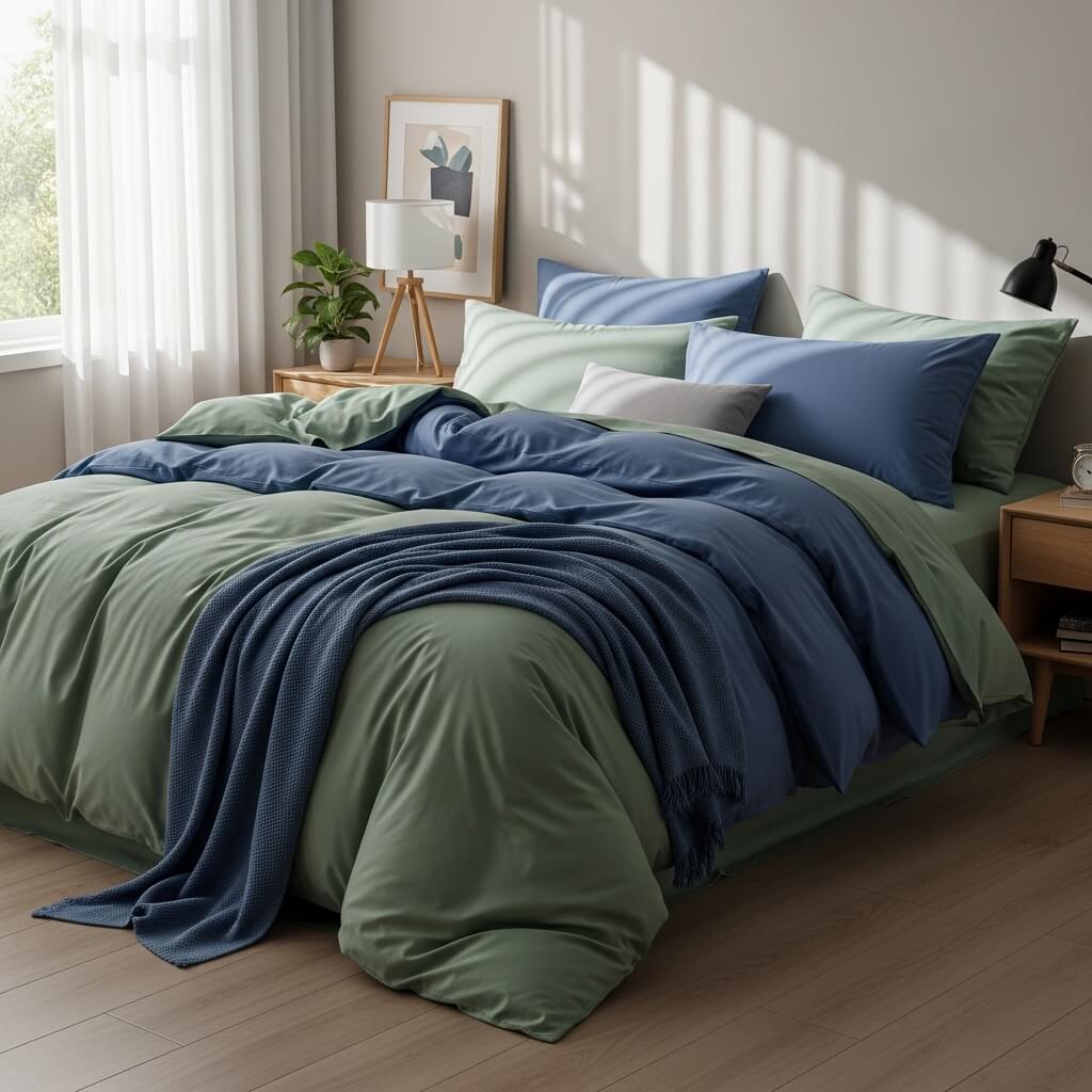 I layer sage green sheets, blue duvets, and a light green throw. This combo makes the bed look styled without trying too hard.