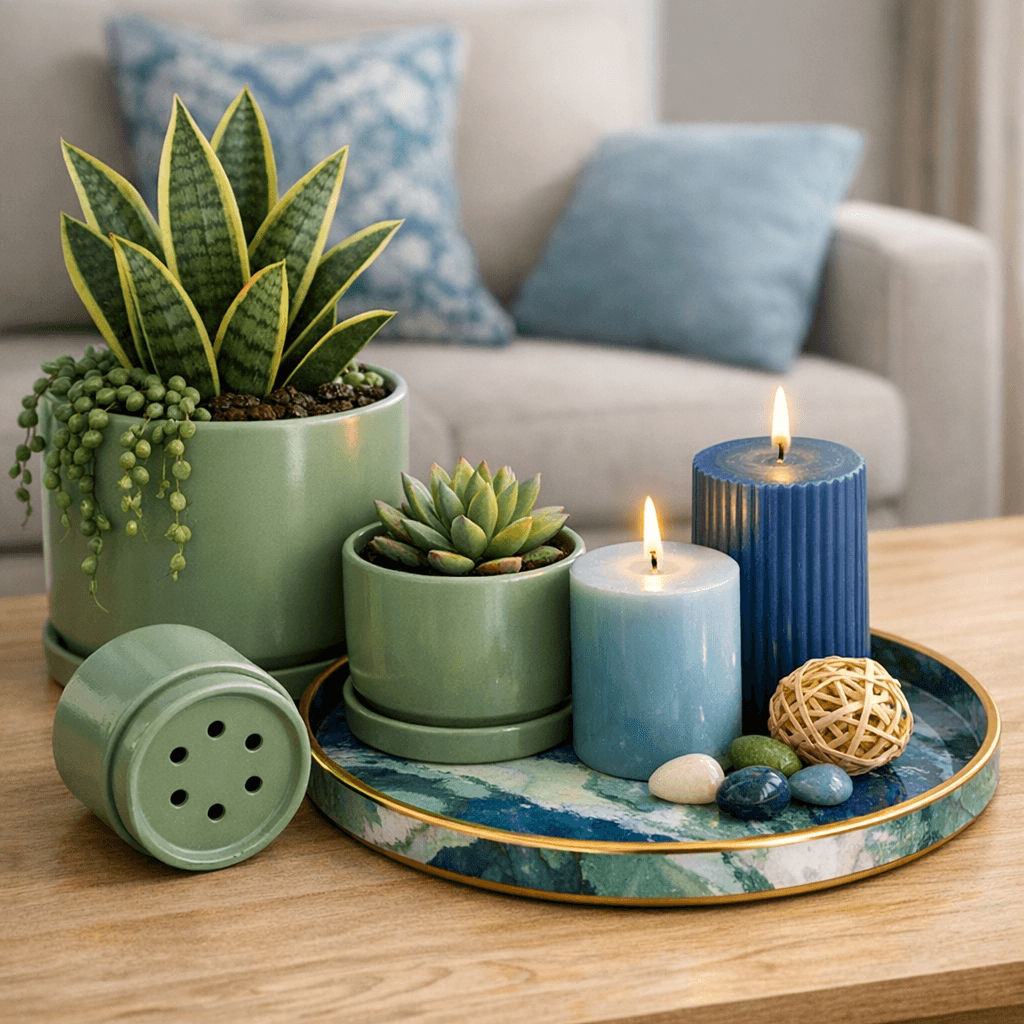 I use sage green planters, blue candles, and mixed color trays to tie everything together. These small items make the room feel personal.