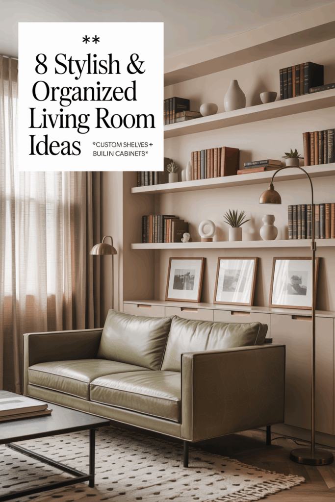 This guide presents living room concepts that emphasize stylish organization through custom shelves and built-in cabinets.