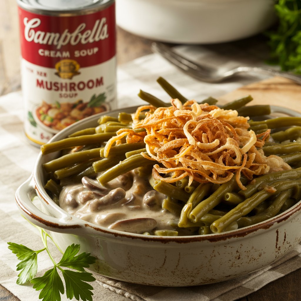 - Campbell’s Cream of Mushroom Soup – Green bean casserole base.