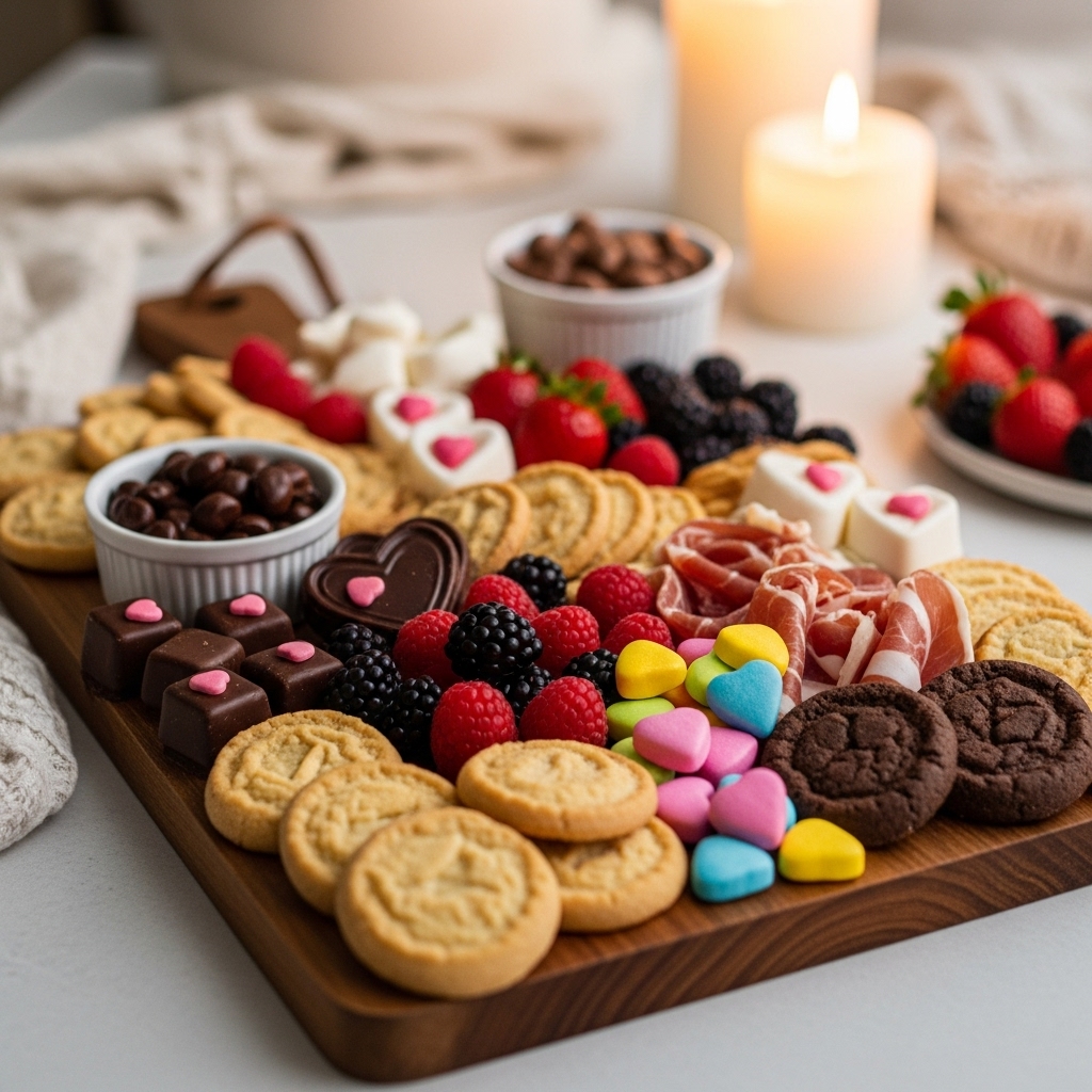 Dessert boards let everyone choose their favorites. I add chocolates, cookies, berries, and candy hearts.