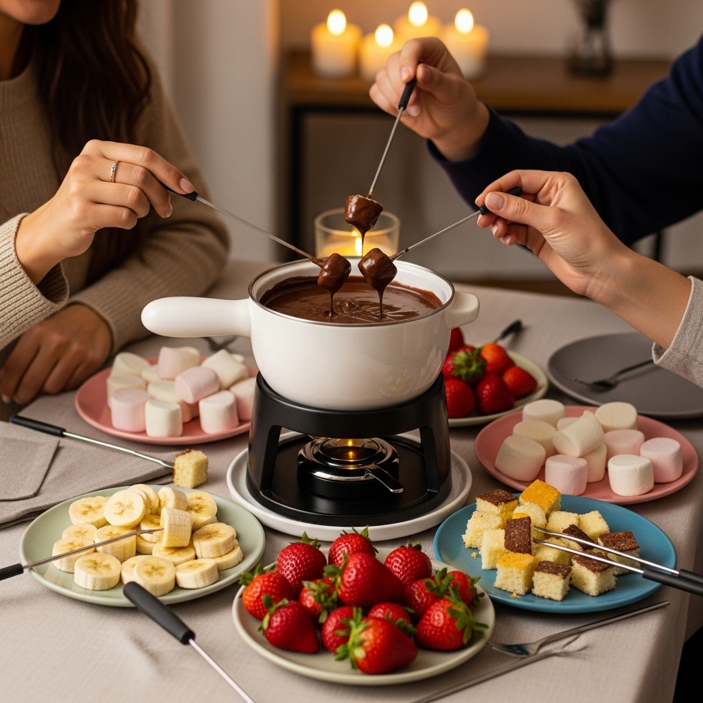 Fondue turns dessert into an experience. I set out fruit, marshmallows, and cake cubes.