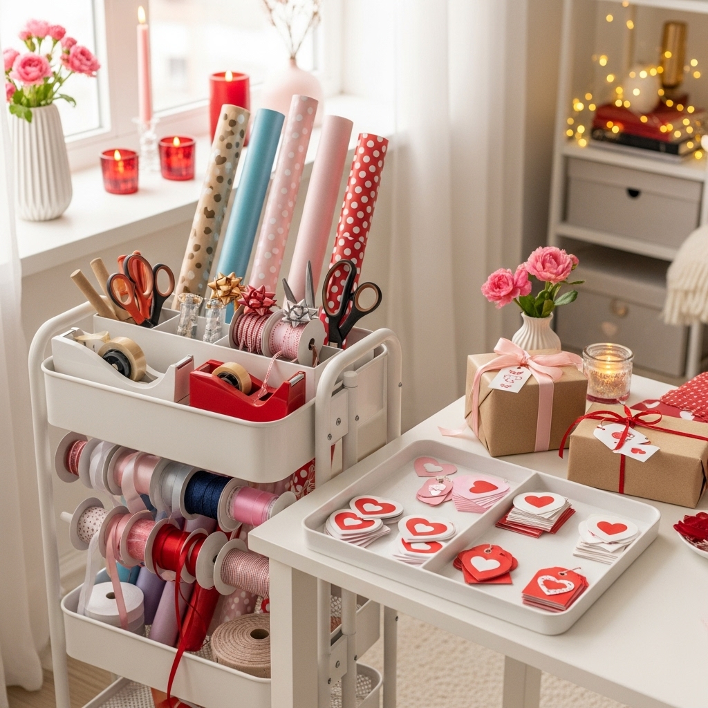 Every holiday needs a home base, and Valentine’s Day deserves one too. I always use one spot in my kitchen or entryway to store cards, candy, ribbons, and gifts. When everything lives in one place, you skip the panic search later.