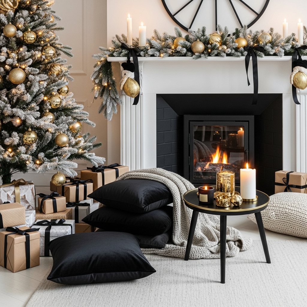 Black grounds the space, gold brings warmth, and white keeps it balanced. Together, they create a modern, sophisticated Christmas vibe that feels both sleek and festive.