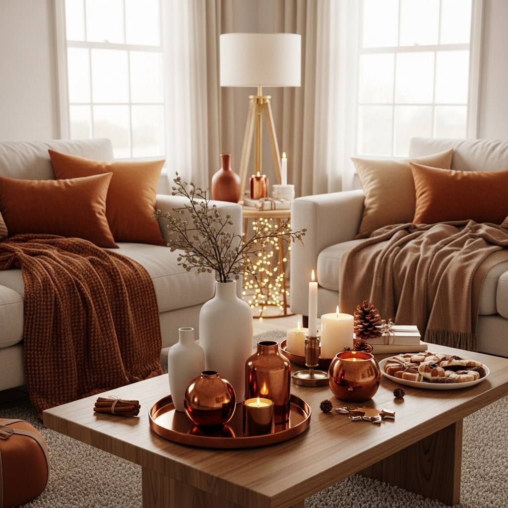 Use woven textures, ceramic vases, and warm metallics to tie everything together. If your living room smells like cinnamon too, well, that’s just bonus points.