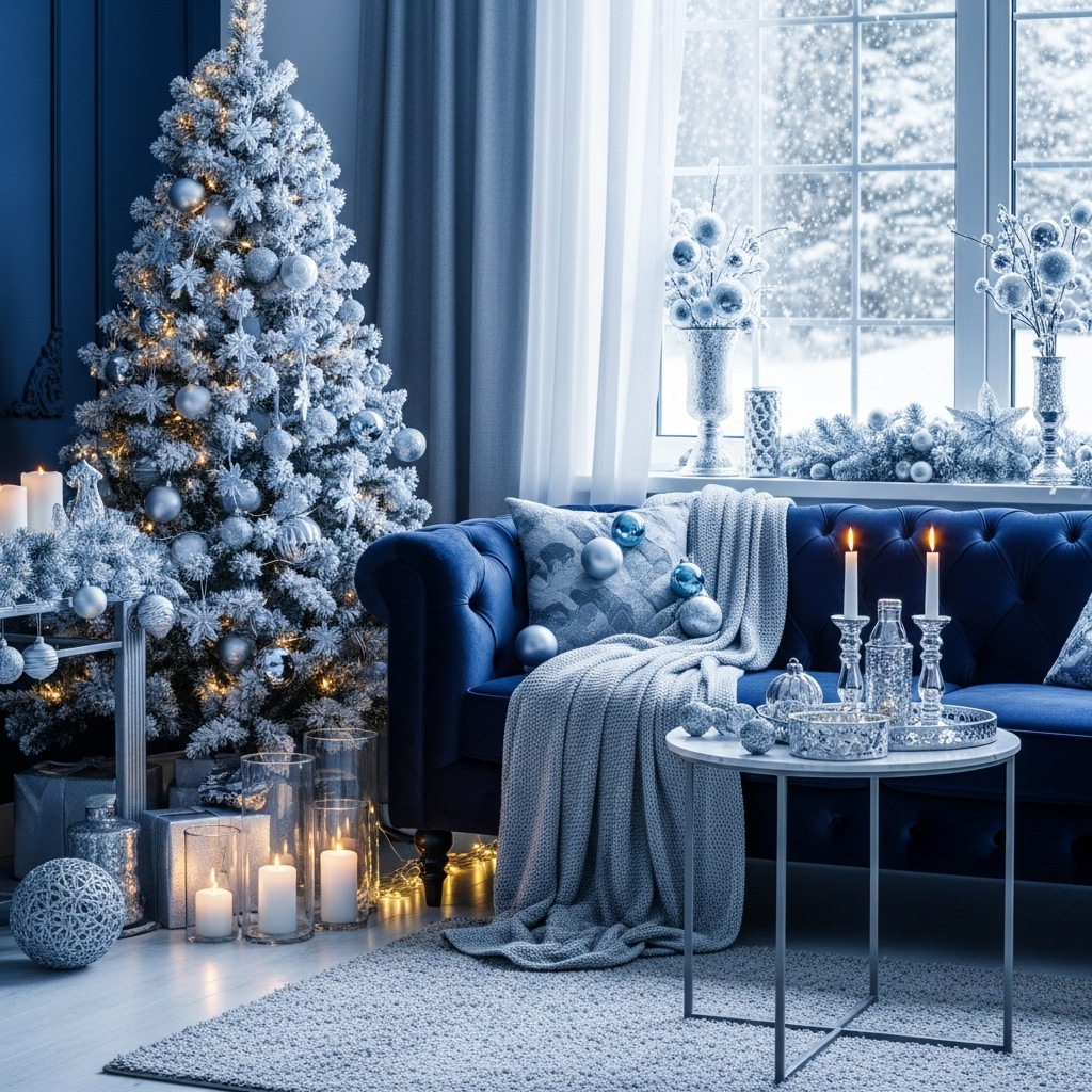 Think: icy blue ornaments, navy throw pillows, silver garlands, and glass candleholders.