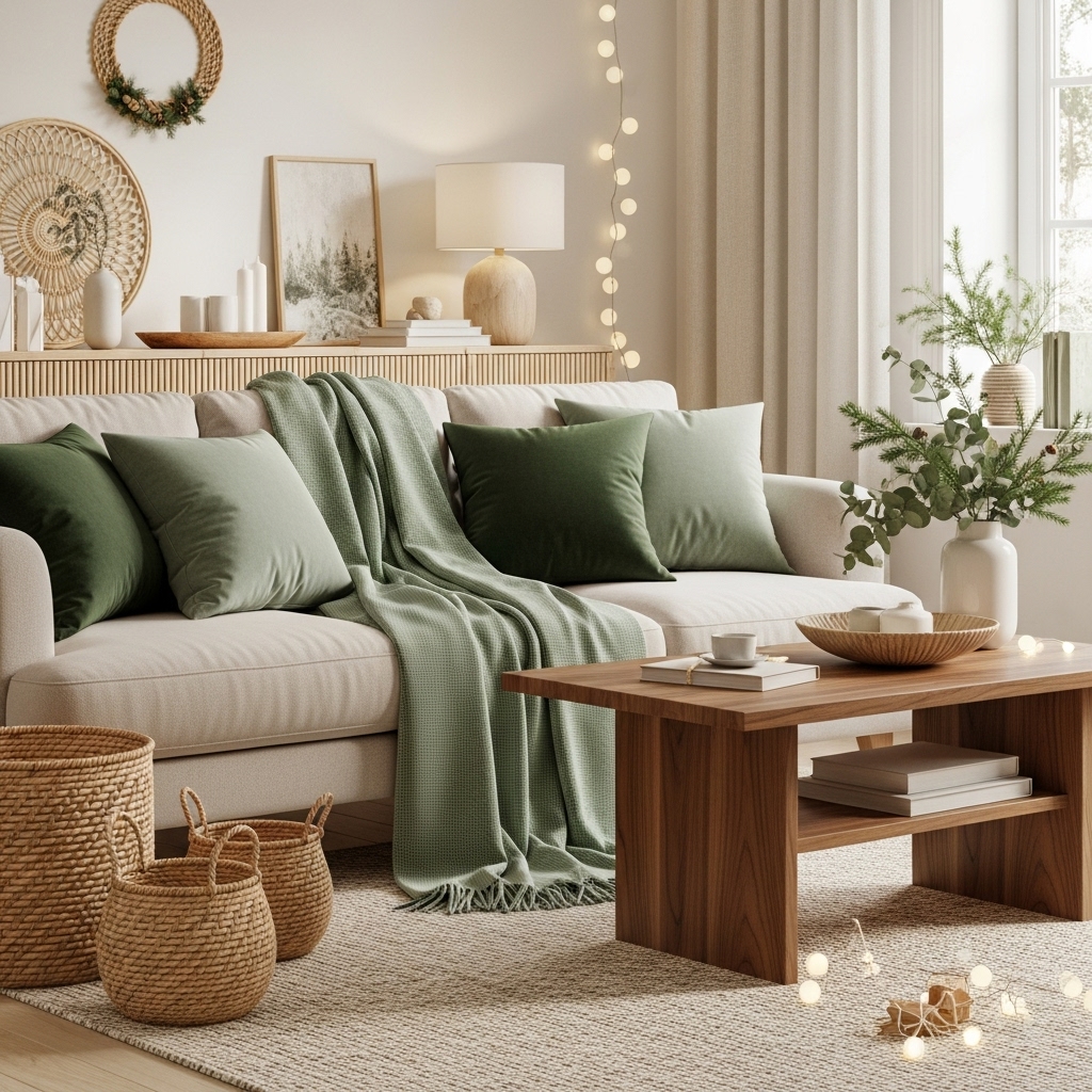 • Add wood accents like walnut coffee tables or woven baskets for that natural, organic warmth.